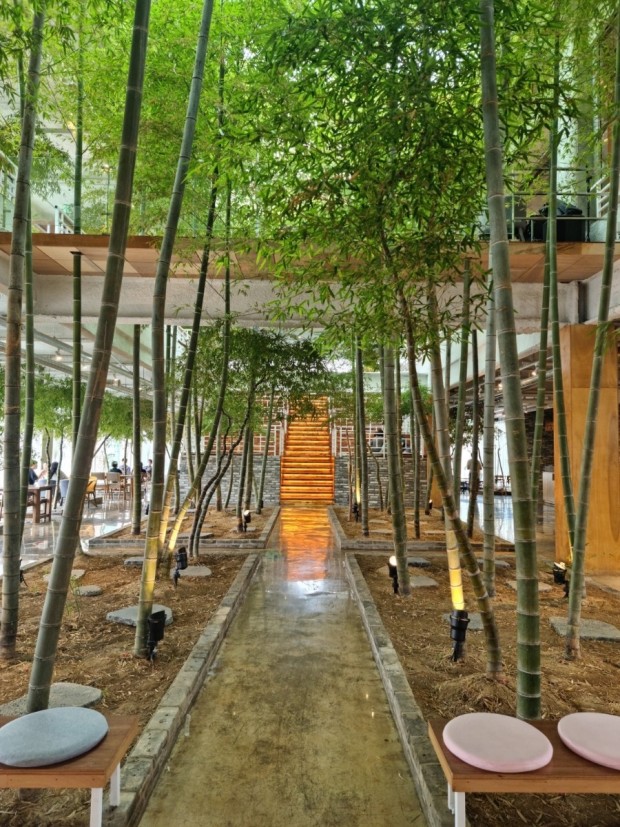 이 카페는 5층부터 7층까지의 공간을 활용하여 다양한 테마의 공간을 제공합니다. 1층에는 대나무가 천장까지 뻗어 있어 마치 대나무 숲에 있는 듯한 느낌을 줍니다. 2층은 캠핑 감성을 담은 공간으로, 자유로운 좌석 배치와 함께 대나무 숲을 즐길 수 있습니다. 5층과 6층의 여자 화장실에는 히든 포토존이 있어 방문객들에게 특별한 경험을 선사합니다.